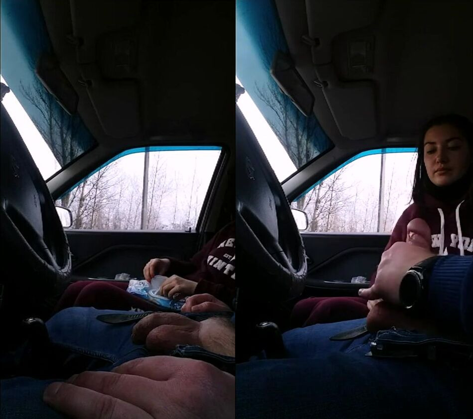 After long conversations in car, the perverted dad persuaded his stepdaughter to suck his balls and cock and then drink his still hot cum.