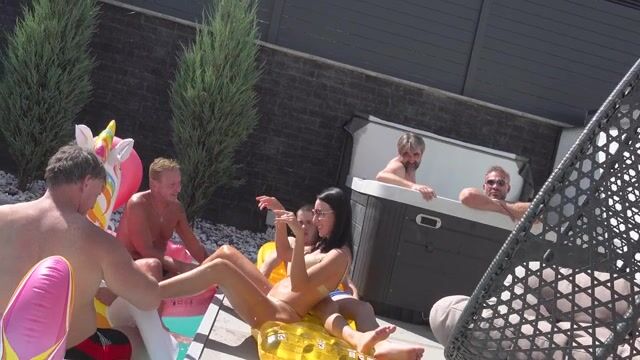 After a pool party, a perverted man and his wife invited their young cousin home, and a gang of uncle's friends were already waiting there, and they all took turns fucking this slutty slut.