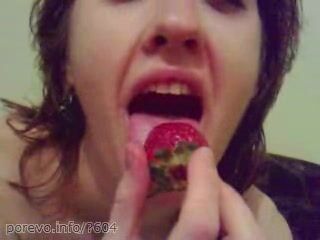 Nephew films his perverted aunt masturbating her ass with fresh strawberries, licking it and inserting it into her anus.