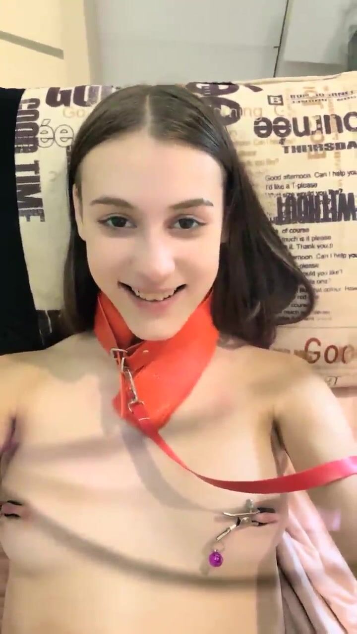 A very cute younger stepsister, a brunette with long hair, asked her brother to fuck her hard. For this, she put on a collar and began to rub her hairy pussy against her brother's cock, suck his cock, and then calmly lay down on her back and began to moan from vaginal fucking.