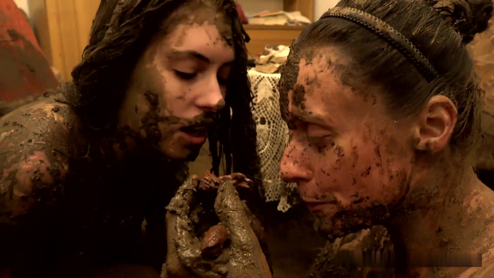 smeared with black clay, mom started licking the pussy of her horny brunette daughter.